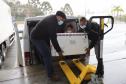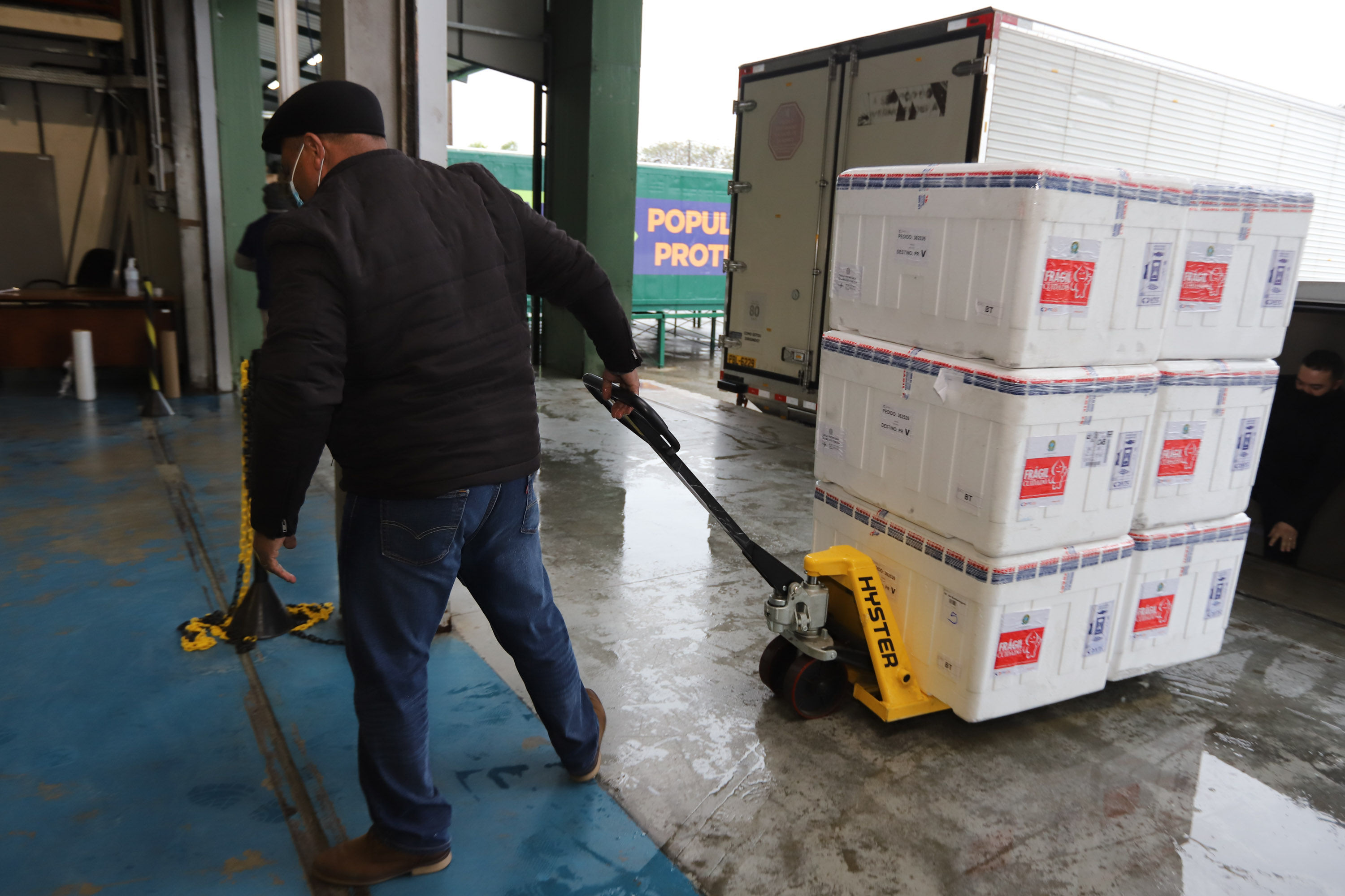 117.760 doses da Coronavac (Sinovac/Butantan) – 960 delas doadas pela Confederação Sul-Americana de Futebol (Conmebol) chegam no Centro de Medicamentos do Paraná (Cemepar), em Curitiba, na manha desta sexta-feira (13).