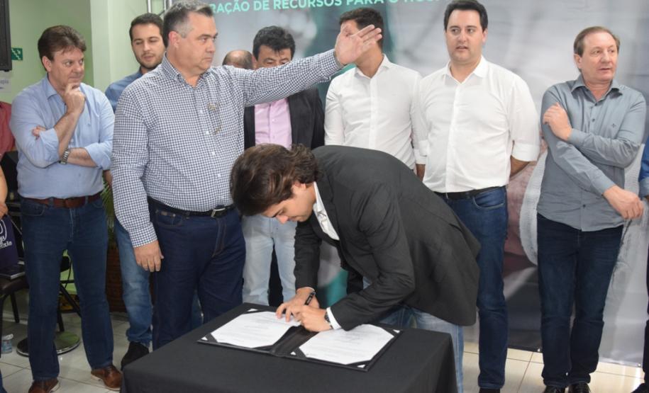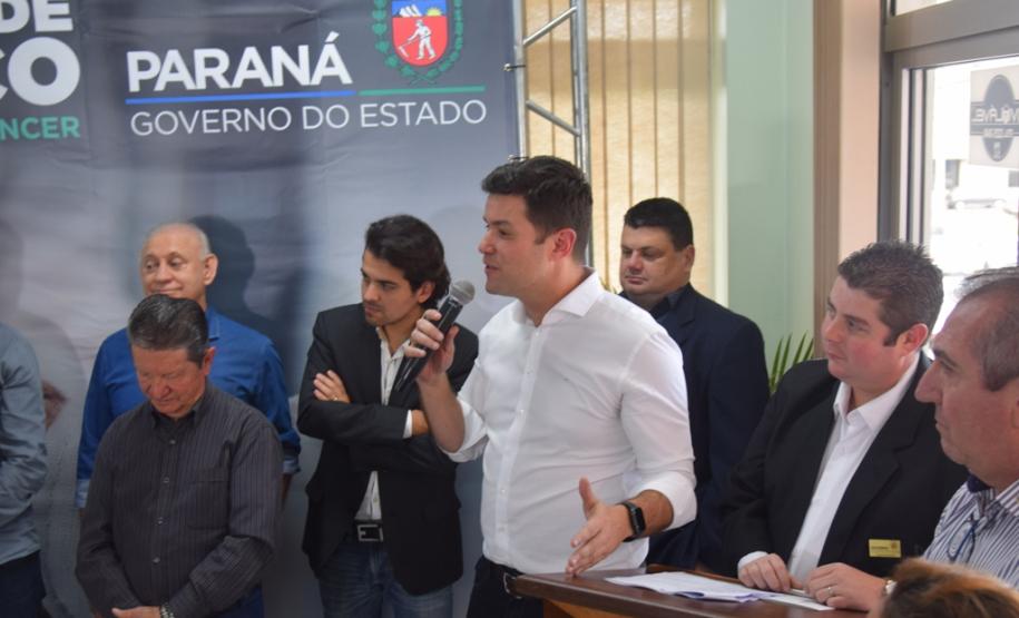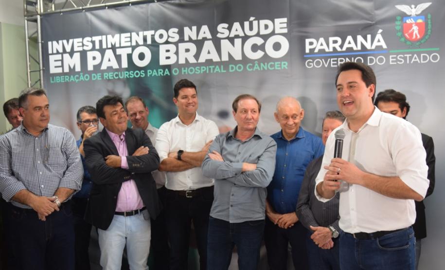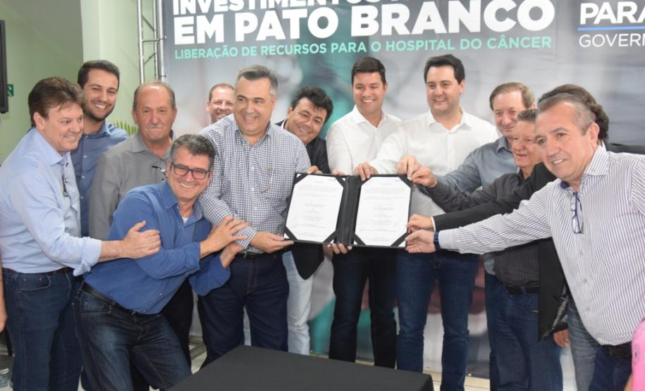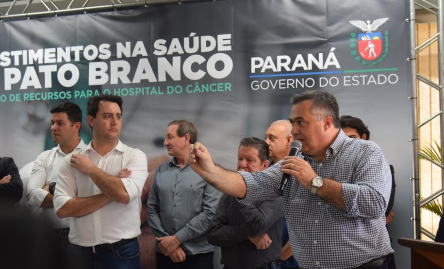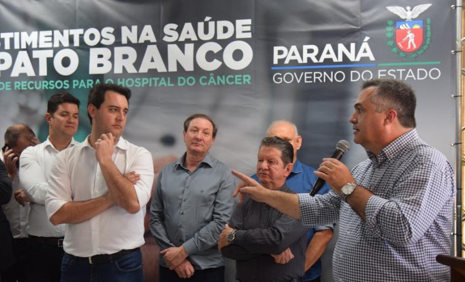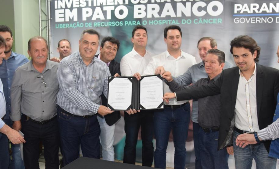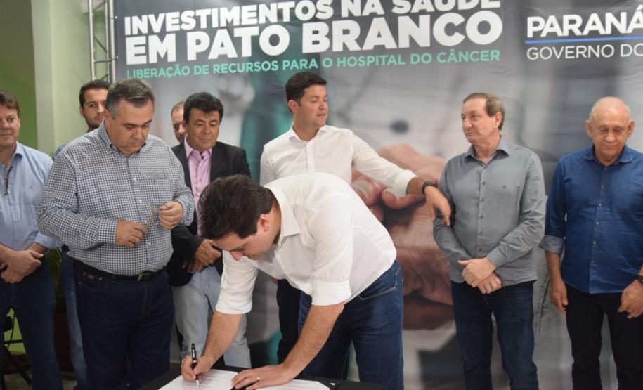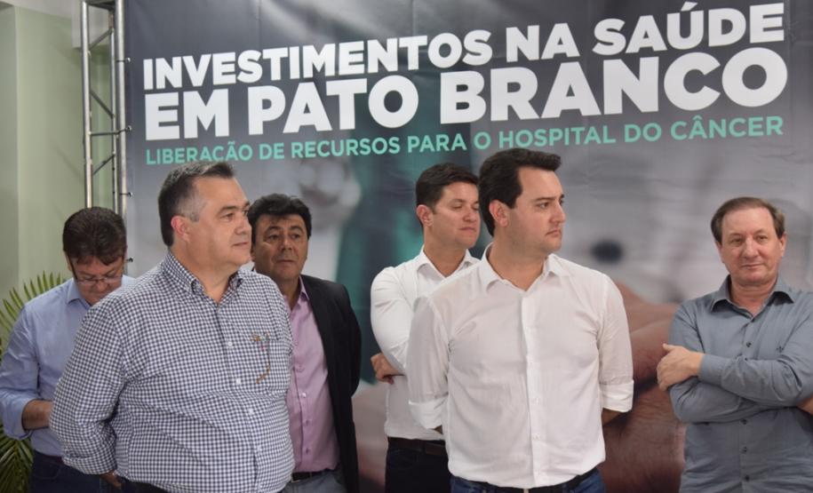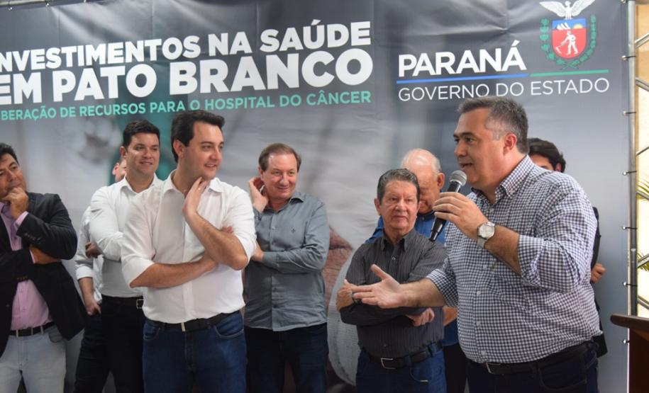 PRESENÇAS - Estiveram presentes na cerimônia os secretários João Carlos Ortega, de Desenvolvimento Urbano e Obras Públicas, e Sandro Alex, de Infraestrutura e Logística; os deputados estaduais Ademar Traiano, Luiz Fernando Guerra, Paulo Litro e Nelson Luersen; o prefeito de Pato Branco, Augustinho Zucchi; além de autoridades locais e lideranças que administram o Hospital do Câncer.