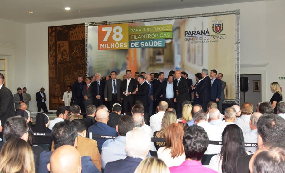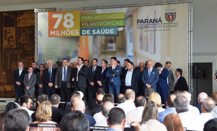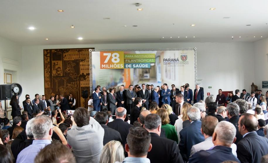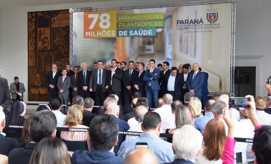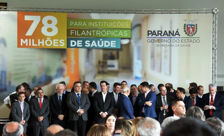 O governador Carlos Massa Ratinho Júnior e o secretário de Estado da Saúde, Beto Preto, anunciaram, na terça-feira (3), a destinação de R$ 78 milhões para 33 instituições filantrópicas. Prefeitos, deputados e representantes dos hospitais de 29 cidades participaram do evento no Palácio Iguaçu.