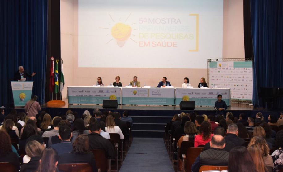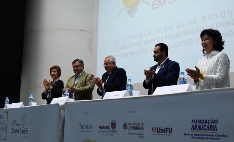 Na mesa de honra da abertura, estavam presentes o diretor presidente do Inesco, João campos, a presidente da Associação Médica de Londrina e conselheira do CRM-PR, Beatriz Emi Tamura; a superintendente do Hospital Universitário, Vivian Feijó, representando o Centro de Ciências da Saúde/Departamento de Saúde Coletiva da UEL; o secretário municipal de saúde de Londrina, Felippe Machado; a presidente da comissão científica da 5ª Mostra e da comissão de julgamento do 4º Prêmio Inova Saúde, Elaine Rossi e a professora Polyanne Mazzucato, representando a UniFil e os coordenadores dos cursos de saúde da instituição.