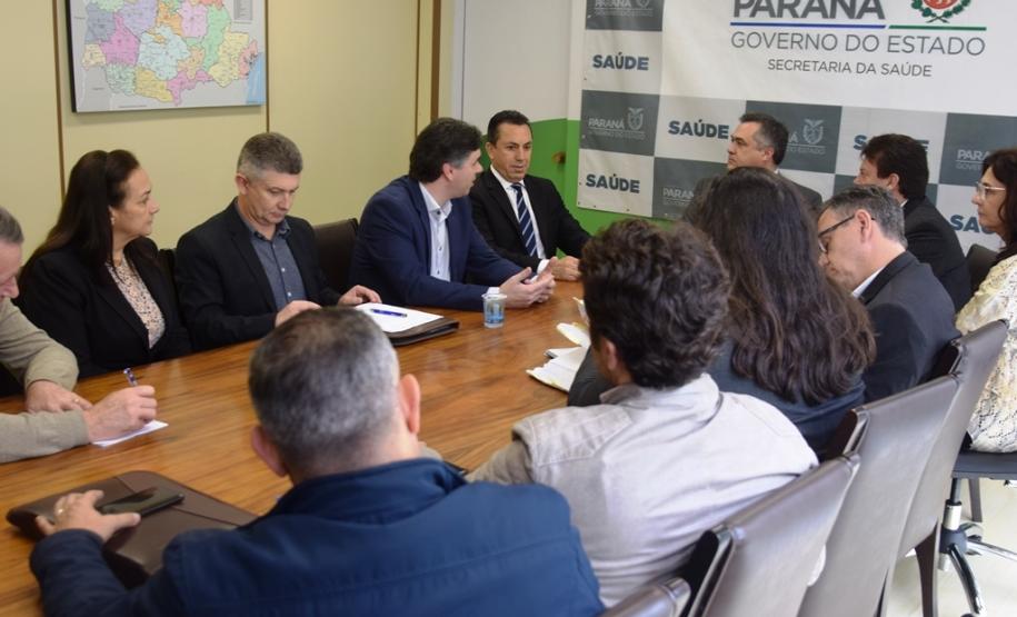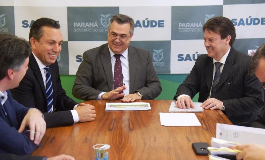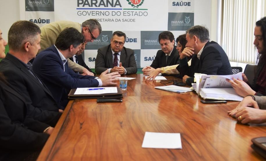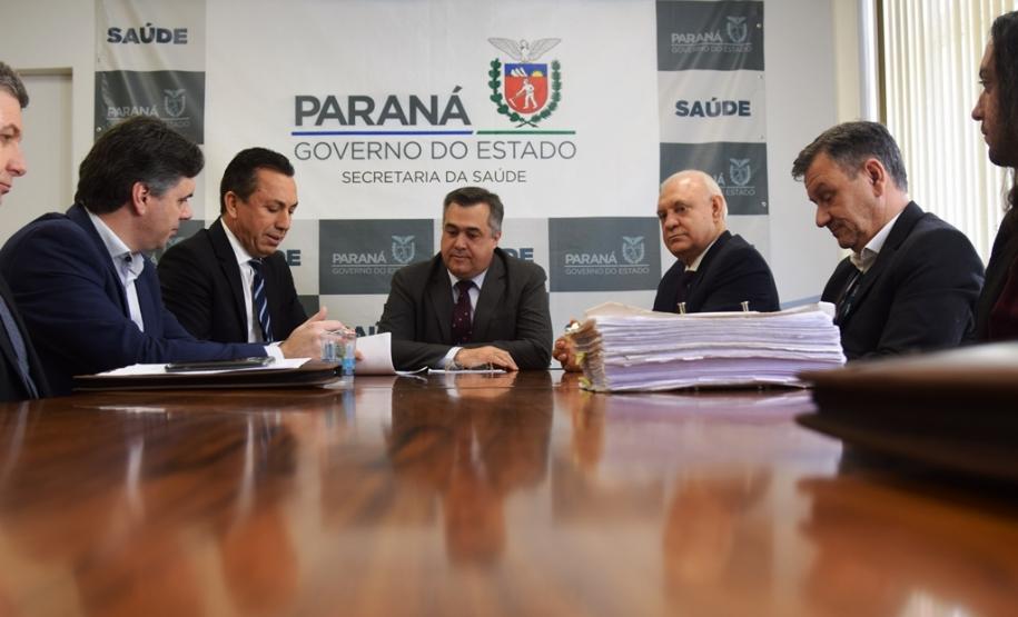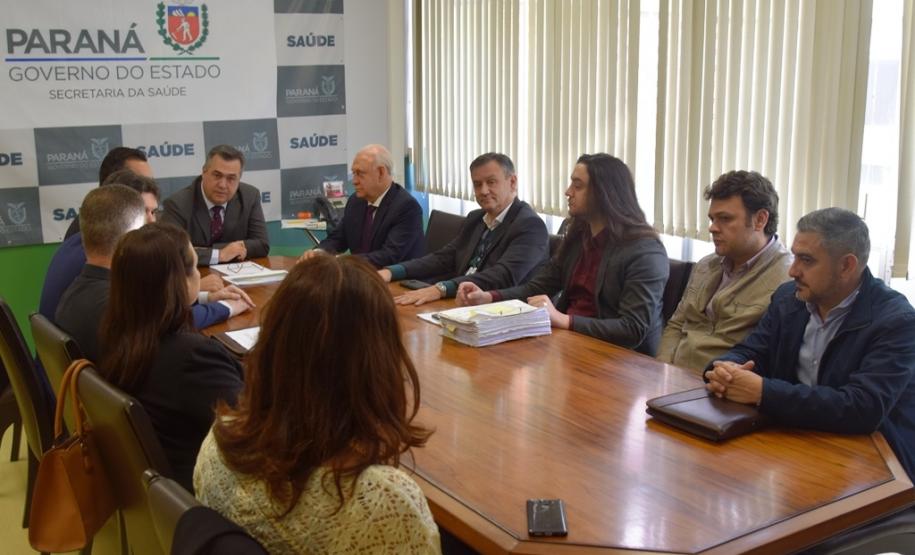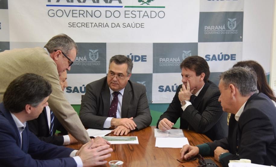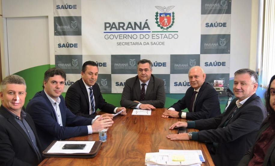 O presidente da Assembleia Legislativa, deputado Ademar Traiano, os deputados Wilmar Reichembach e Nelson Luersen estiveram na Secretaria de Estado da Saúde (Sesa), acompanhados dos prefeitos de Francisco Beltrão, Cleber Fontana; de Salgado Filho, Helton Pedro Pfeifer; de Flor da Serra do Sul, Lucinda Ribeiro de Lima Rosa e de Bom Jesus do Sul, Cezar Bueno, para discutir o trabalho do Hospital Regional do Sudoeste em Francisco Beltrão nesta terça-feira (3).