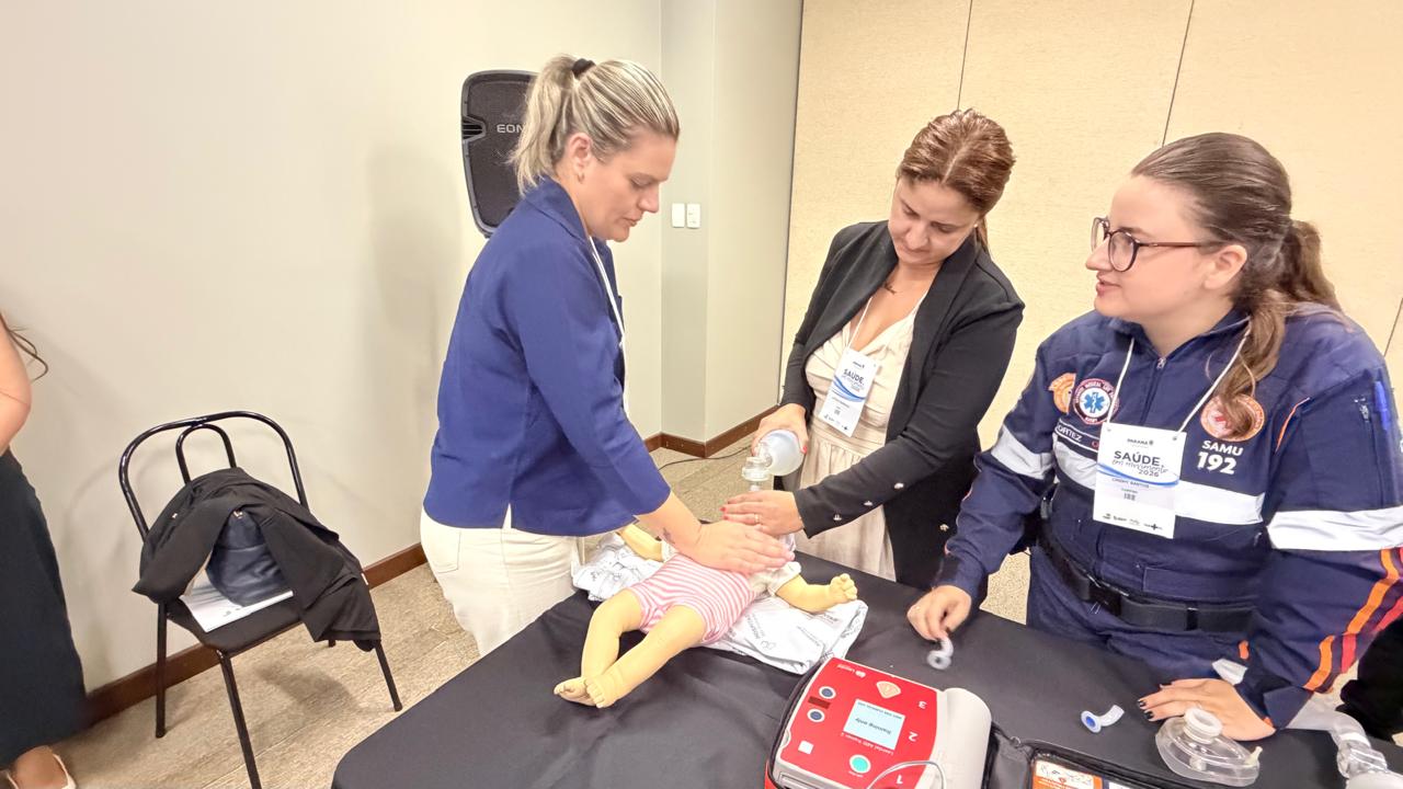 A oficina “Manejo das Urgências na APS: da identificação ao encaminhamento” montou cinco estações de trabalho com foco no atendimento a crianças e adultos em situação grave. Ao longo dos três dias de evento, cerca de 500 profissionais de diferentes áreas participam de aulas sobre atendimento a engasgo, desobstrução de vias aéreas em bebês, ressuscitação cardiopulmonar e intubação orotraqueal, além de participarem de uma atividade prática dentro de uma ambulância.